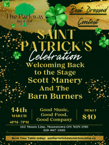 Join us for an early St. Paddy’s Day Party with live music by Scott Manery and the Barn Burners. They will be playing from 4 pm to 7 pm and our full menu will be available.
