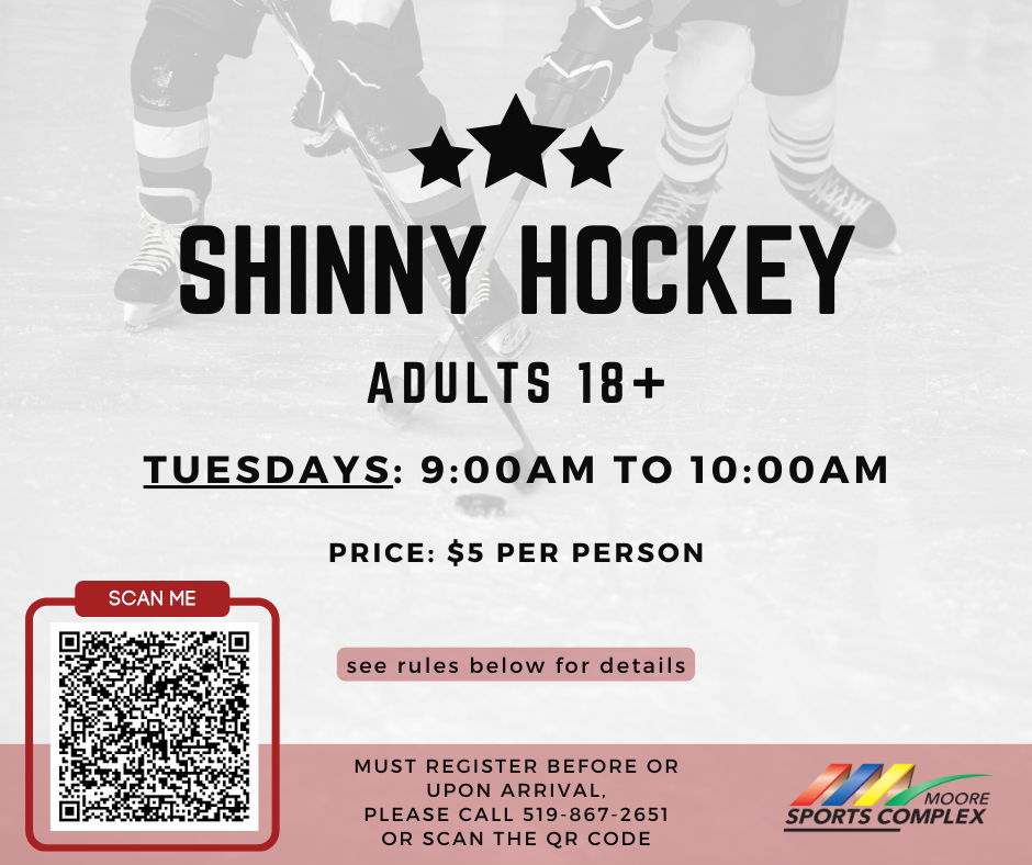 - Shinny Programs are not staffed. Each participant acknowledges the inherent risks associated with hockey and shall participate at their own risk.
